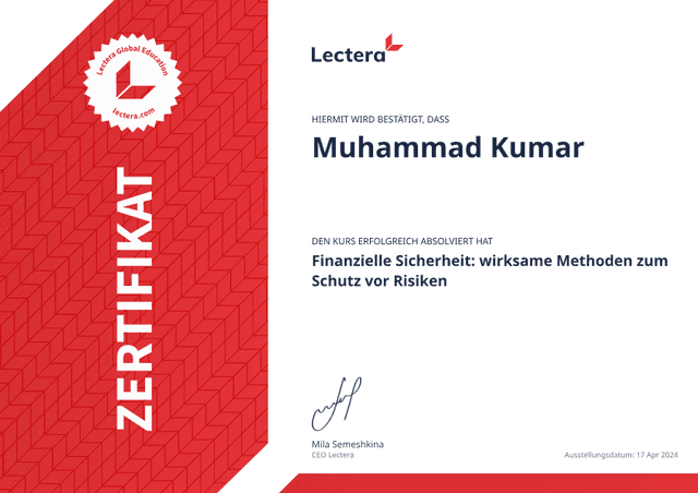 Unser Online-Kurs wird Ihnen helfen, Ihr Einkommen zu sparen und die Ersparnisse so anzulegen, dass sie Einkommen bringen. Wir sprechen über finanzielle Sicherheit, Sie erfahren über die Möglichkeiten der Geldaufbewahrung in Banken und lernen, wie Sie durch das Investieren in Wertpapieren Ihr Einkommen steigern können. Wir erzählen Ihnen über den Kryptowährungsmarkt und wie Sie mit digitaler Währung Geld verdienen können. Wir besprechen überdies Schneeballsysteme und andere Arten von Betrug. Schließlich lernen Sie alles über die persönliche finanzielle Sicherheit und verstehen, warum Sie eine Versicherung abschließen sollten.
